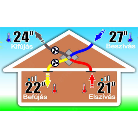 • Automatikus téli / nyári Bypass funkció: egy ún. elkerülő ág, amelyen keresztül kikerüli a hővisszanyerő a hőcserélőt és kiegyenlíti a levegő hőmérsékletét.